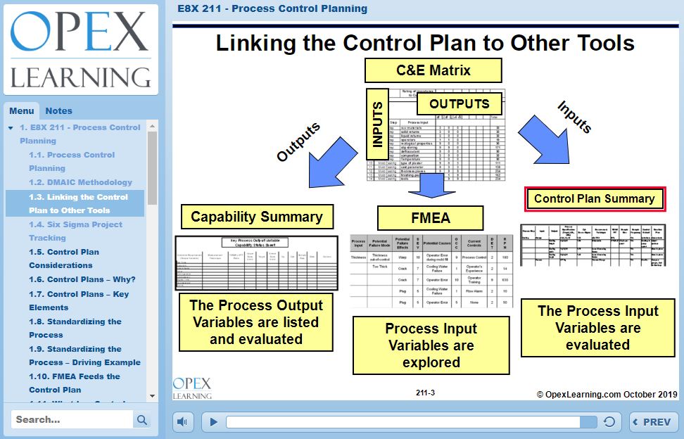 - Project Control Planning – a summary table to describe the sampling plan and data monitoring within a process