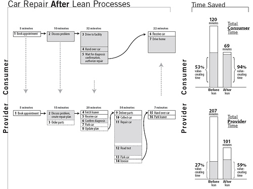 One of the best ways to view what the customer’s experience looks and feels like is to create a Consumption Map. Below is a Consumption Map of a Car Repair Experience: