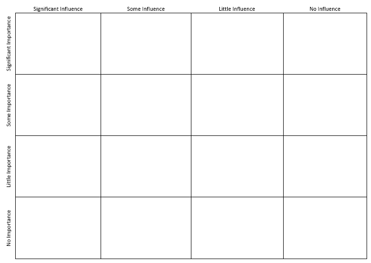 ![]() Stakeholder Analysis Template Used to capture stakeholders and rank them by the perceived strength of their influence. Download PPTX file or learn more |