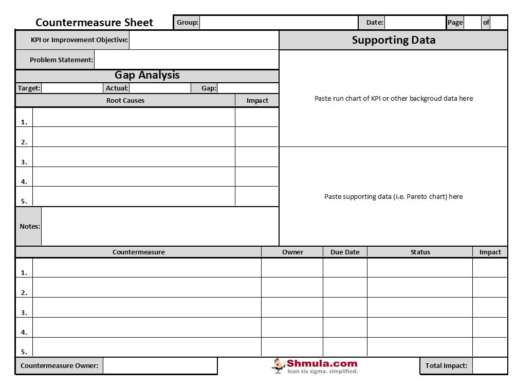 ![]() Countermeasure Template A basic template to help you identify the countermeasures (ideas), owners, and timeline to implement solutions to root causes. Download XLSX file or learn more |