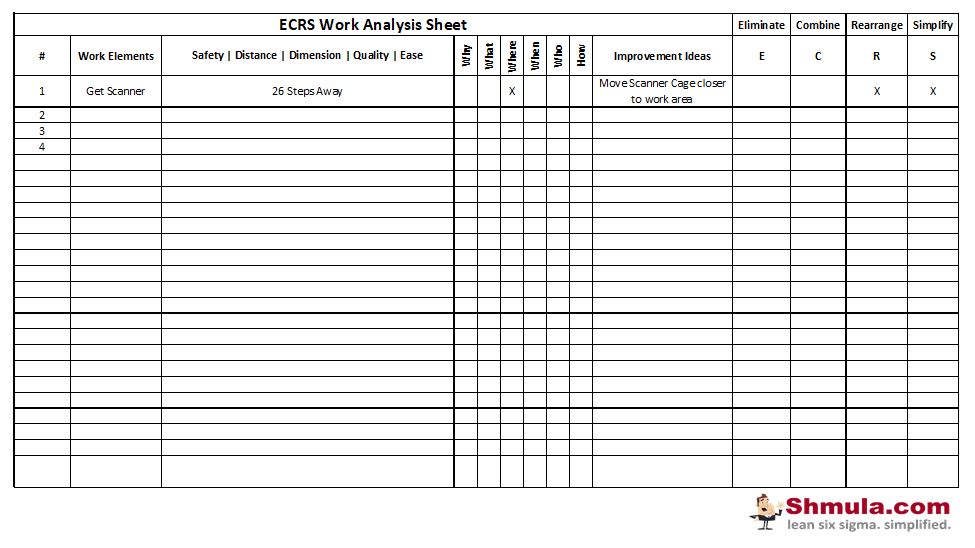 ![]() ECRS Work Analysis Template Eliminate, Combine, Rearrange, and Simplify template to quickly identify wastes and implement immediate improvements.. Download XLXS file or learn more |