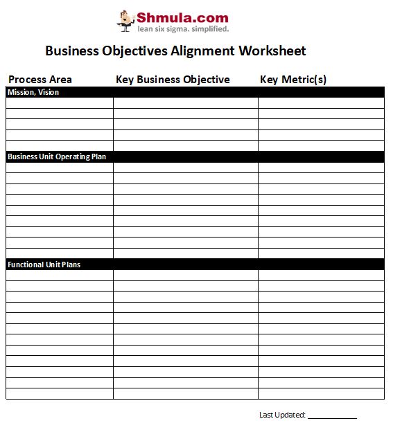 ![]() Business Unit Objectives Alignment Worksheet A simple and easy tool to ensure your lean and six sigma projects are aligned to business objectives and metrics. Download XLSX file or learn more |