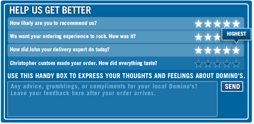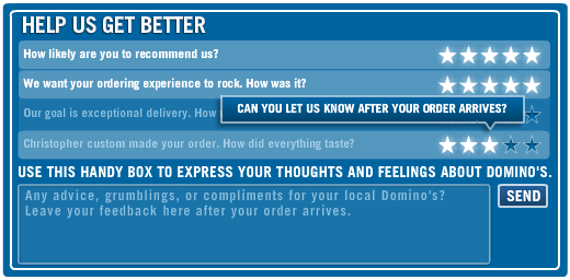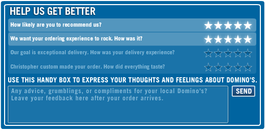 But wait – it doesn’t stop there. Domino’s Pizza takes a question it’s been getting for years and makes it into an opportunity to improve how they operate. The Domino’s Tracker also provides a 5 question survey entitle “Help us Get Better”, which is phrased in a simple but compelling way – in a way that would make me want to complete the survey.