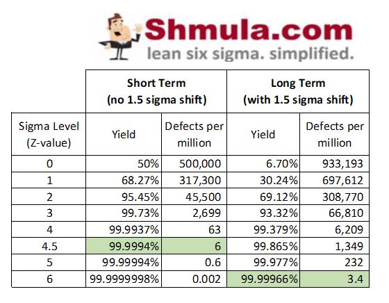 As you can see in the table below, the short term sigma level of 4.5 is the same as the long term 6 sigma level.